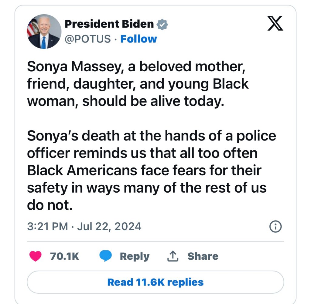 Sonya Massey was needlessly shot & killed by a police officer on July 6, 2024.