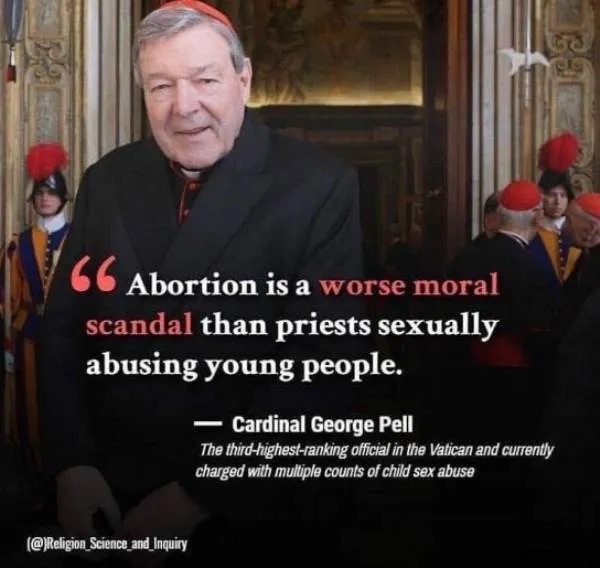 He didn’t back down on his gross comparison when given the chance, he dug in. As a reward for his convictions, in 2014 he was promoted to what news outlets described as the third highest position within the Vatican. He thrived in his veil of lies and deflection until 2017ish when he was charged and convicted with historical child sex abuse, allegedly dating back to the 1960s. Justice was served in a courtroom… I guess… untimely though and makes me wonder how many kids weren’t heard.