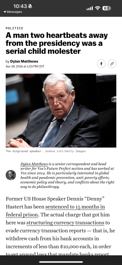 Dennis Hastert, former US Speaker of the House, an admitted child sex abuser. Papa Dave supported him when he was in office before the sex abuse allegations came out. He fooled my dad, even coached against my dad’s high school team in wrestling.